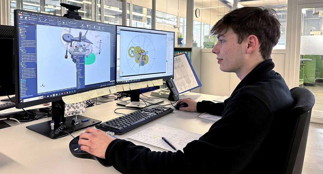 Ab dem dritten Jahr geht’s richtig los: Du arbeitest an Hightech-Fräs- und Drehmaschinen und stellst komplexe Teile her – etwa Uhrwerkplatinen, Maschinenbauteile oder Prüfmittel.